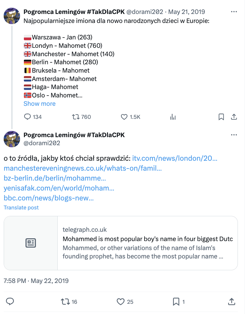 Od pewnego czasu po sieci krąży grafika przedstawiająca najpopularniejsze imiona dla nowonarodzonych dzieci w Europie – w maju 2024 roku pojawiła się na X, w lipcu na TikToku, a w grudniu na JBZD. Wynika z niej, że w Londynie, Manchesterze, Berlinie, Brukseli, Amsterdamie, Hadze i Oslo największym powodzeniem cieszy się arabskie imię Mahomet. Na tle tych miejsc wyróżnia się Warszawa, gdzie numerem jeden jest Jan. Sprawdźmy, czy informacje podane na viralowej grafice są prawdziwe.