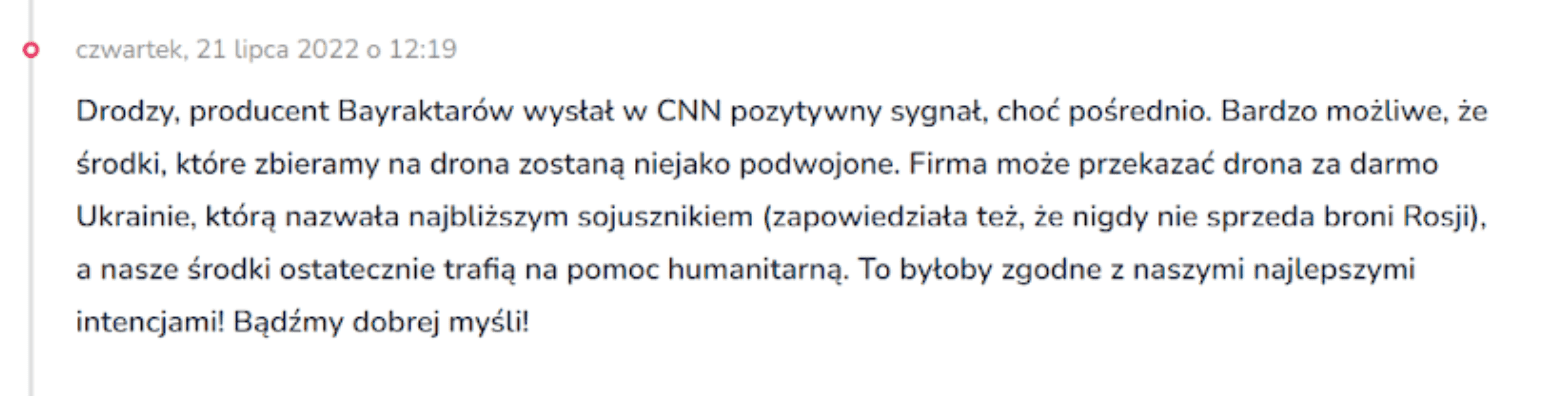 Publicysta poinformował o możliwej zmianie przedmiotu inwestycji zebranych funduszy na portalu zrzutka.pl już 21 lipca, czyli wówczas, gdy wypłynęła nieoficjalna informacja o możliwości przekazania przez firmę Baykar drona za darmo.