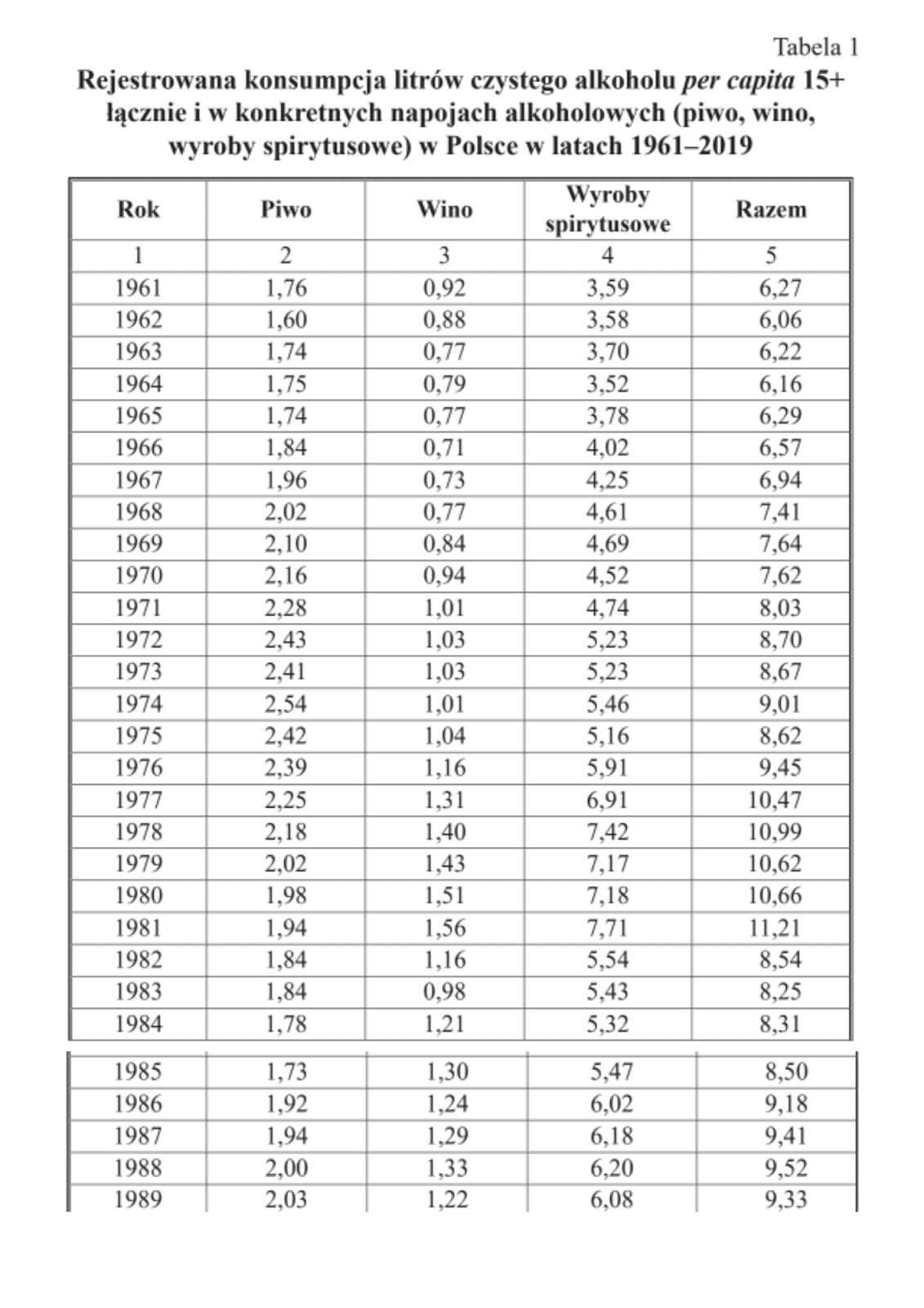 Innej odpowiedzi udzieliła nam dr Katarzyna Agnieszka Obłąkowska, autorka licznych publikacji naukowych i raportów dotyczących rynku alkoholowego w Polsce. Udostępniła nam swój artykuł Alkohol w społeczeństwie polskim i polska polityka publiczna wobec alkoholu na przestrzeni dziejów. Pomiędzy piwnym wolnym rynkiem a spirytusowym monopolem, który napisała wraz z dr Arturem Bartoszewiczem i opublikowała w 2022 roku. Poniżej przedstawiamy zawartą w nim tabelę przedstawiającą rejestrowaną konsumpcję alkoholu w latach 1961-1989: