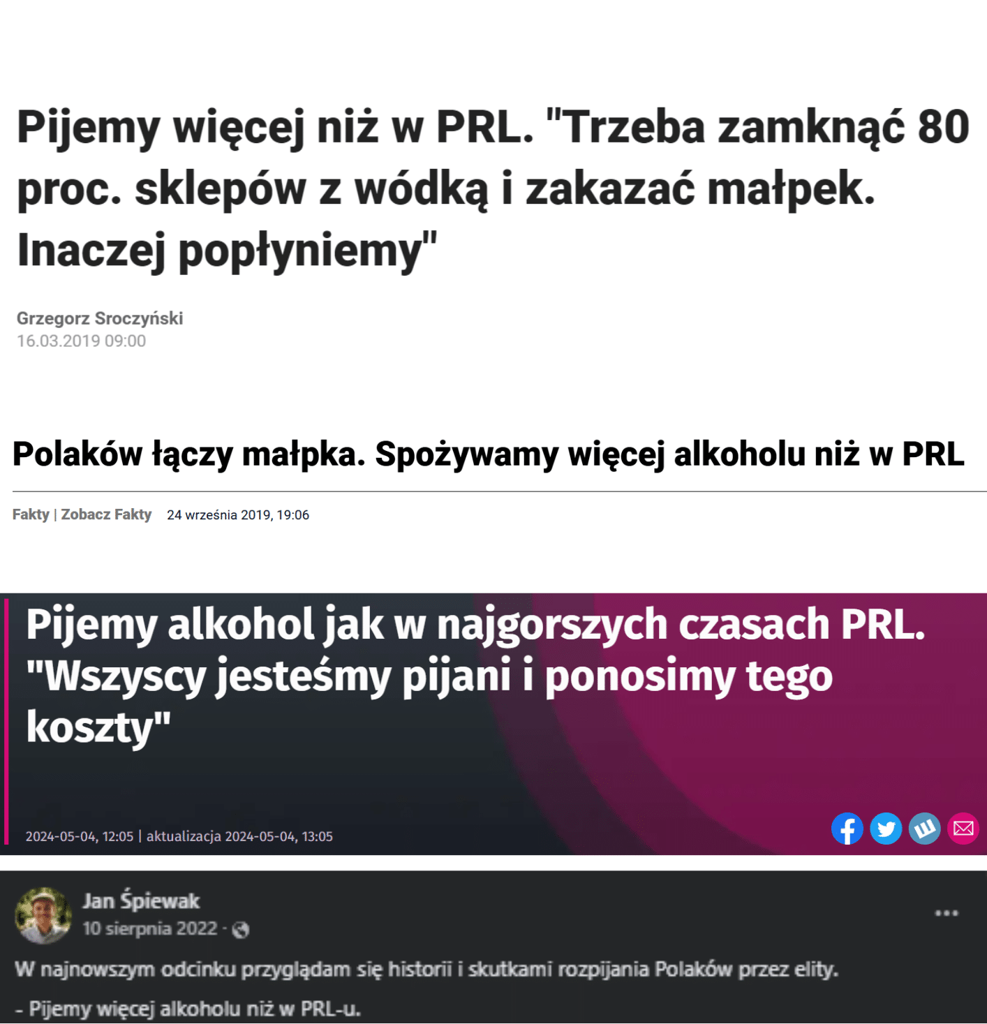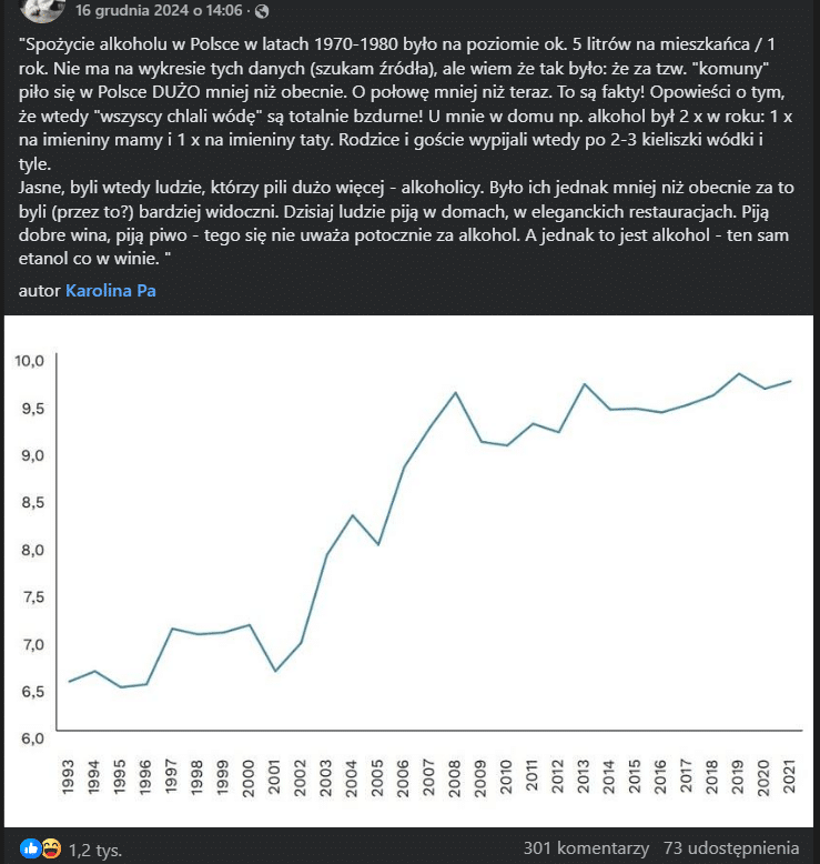 16 grudnia 2024 roku na Facebooku pojawił się post, którego autor cytuje wpis innej użytkowniczki tej platformy. Stwierdziła ona, że “[...] za tzw. »komuny« piło się w Polsce DUŻO mniej niż obecnie. O połowę mniej niż teraz. To są fakty! Opowieści o tym, że wtedy »wszyscy chlali wódę« są totalnie bzdurne!”.