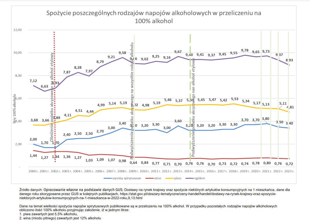 Według GUS i KCPU w 2023 roku na jednego mieszkańca przypadło 8,93 litra alkoholu. Tendencja jest zatem spadkowa w porównaniu do poprzednich lat, kiedy to wyniki przekraczały 9 litrów na głowę.