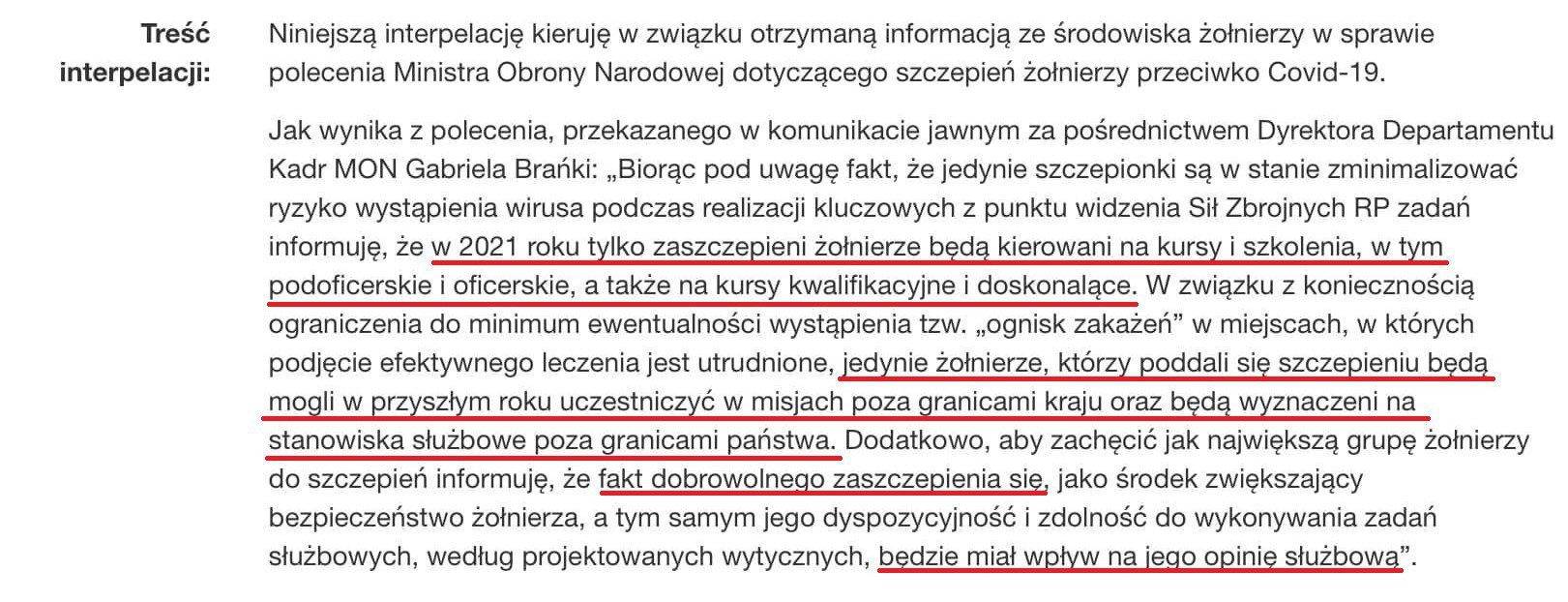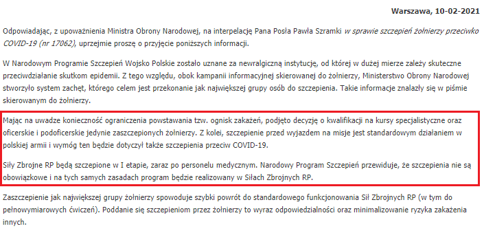 W odpowiedzi na interpelację Ministerstwo Obrony Narodowej poinformowało, że ?[...] szczepienie przed wyjazdem na misje jest standardowym działaniem w polskiej armii i wymóg ten będzie dotyczył także szczepienia przeciw COVID-19?.