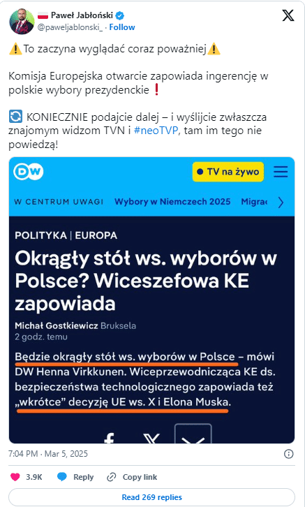 „Komisja Europejska otwarcie zapowiada ingerencję w polskie wybory prezydenckie” – twierdzi we wpisie opublikowanym 5 marca 2025 roku na platformie X poseł Prawa i Sprawiedliwości Paweł Jabłoński.