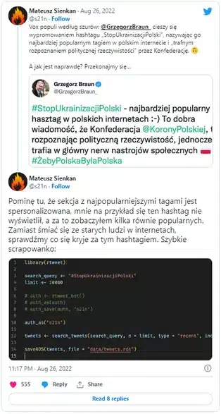 Ostatnio na Twitterze coraz częściej można spotkać się z hasztagiem #StopUkrainizacjiPolski. Poseł Konfederacji, znany z kontrowersyjnych, często antyukraińskich wypowiedzi Grzegorz Braun, w jednym ze swoich wpisów stwierdził nawet, że popularność tego znacznika jest dowodem na to, że jego partia „trafnie rozpoznaje społeczną rzeczywistość”. Pewien użytkownik platformy postanowił przeprowadzić małe śledztwo, by sprawdzić, kto tak naprawdę stoi za wpisami ze wspomnianym hasztagiem. Czego się dowiedział?