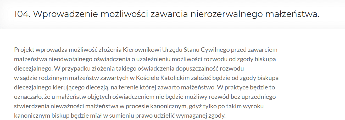 W archiwalnej wersji strony 100ustawmentzena.pl zachowała się propozycja wprowadzenia „możliwości zawarcia nierozerwalnego małżeństwa”.