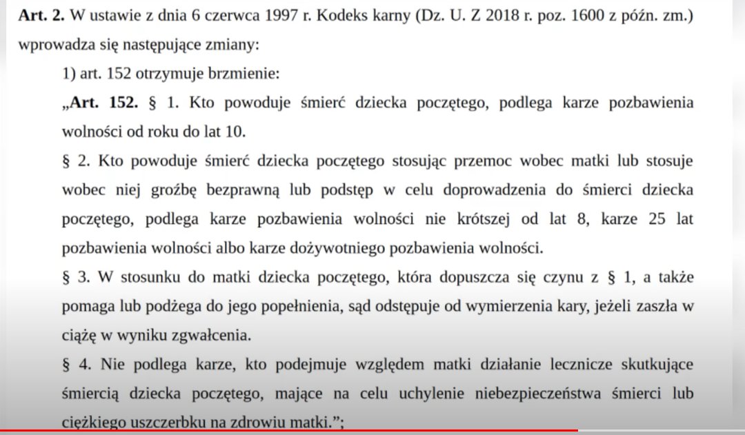 Z dostępnych w mediach społecznościowych i na portalach informacyjnych fragmentów ustaw wynika, że „ustawa o ochronie życia dziecka poczętego” zakładała całkowite zniesienie legalności aborcji. „Kto powoduje śmierć dziecka poczętego, podlega karze pozbawienia wolności od roku do lat 10” – można było przeczytać w propozycji ustawy.