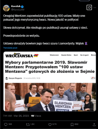 Biejat najprawdopodobniej nawiązuje do tzw. „100 ustaw Mentzena” – zestawu propozycji, które polityk opublikował w 2019 roku. Zapytaliśmy kandydatkę Lewicy, czy to właśnie do tego projektu odnosi się w swoim wpisie. Artykuł zostanie zaktualizowany, gdy otrzymamy odpowiedź.