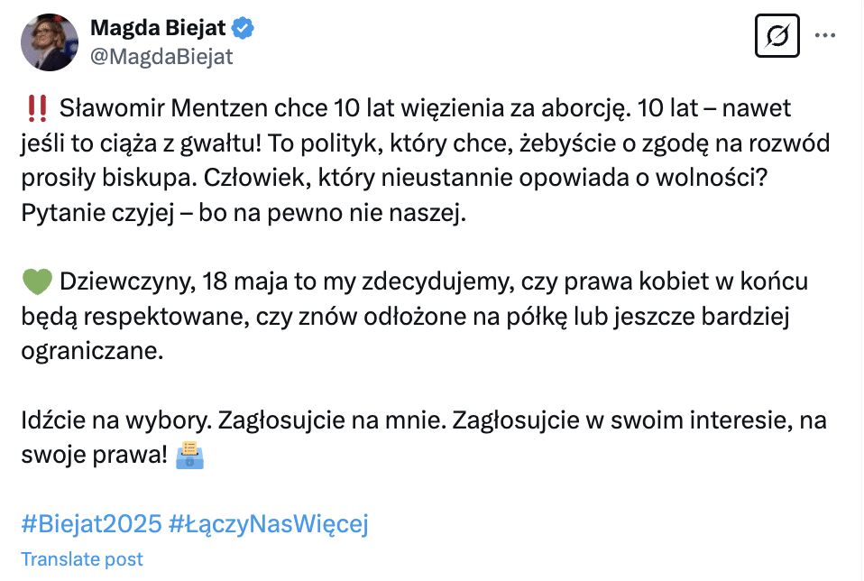 „Sławomir Mentzen chce 10 lat więzienia za aborcję. 10 lat – nawet jeśli to ciąża z gwałtu! To polityk, który chce, żebyście o zgodę na rozwód prosiły biskupa. Człowiek, który nieustannie opowiada o wolności? Pytanie czyjej – bo na pewno nie naszej” – taki wpis na X opublikowała 8 marca 2025 roku Magdalena Biejat, kandydatka Lewicy na prezydenta.