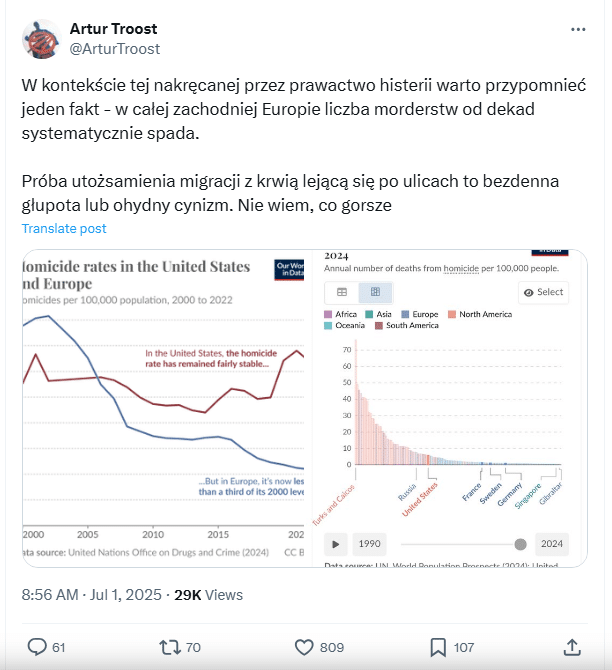 „W kontekście tej nakręcanej przez prawactwo histerii warto przypomnieć jeden fakt - w całej zachodniej Europie liczba morderstw od dekad systematycznie spada. Próba utożsamienia migracji z krwią lejącą się po ulicach to bezdenna głupota [...]” – napisał jeden z użytkowników platformy. Do swojego wpisu dołączył dwa wykresy mające potwierdzać tę tezę.