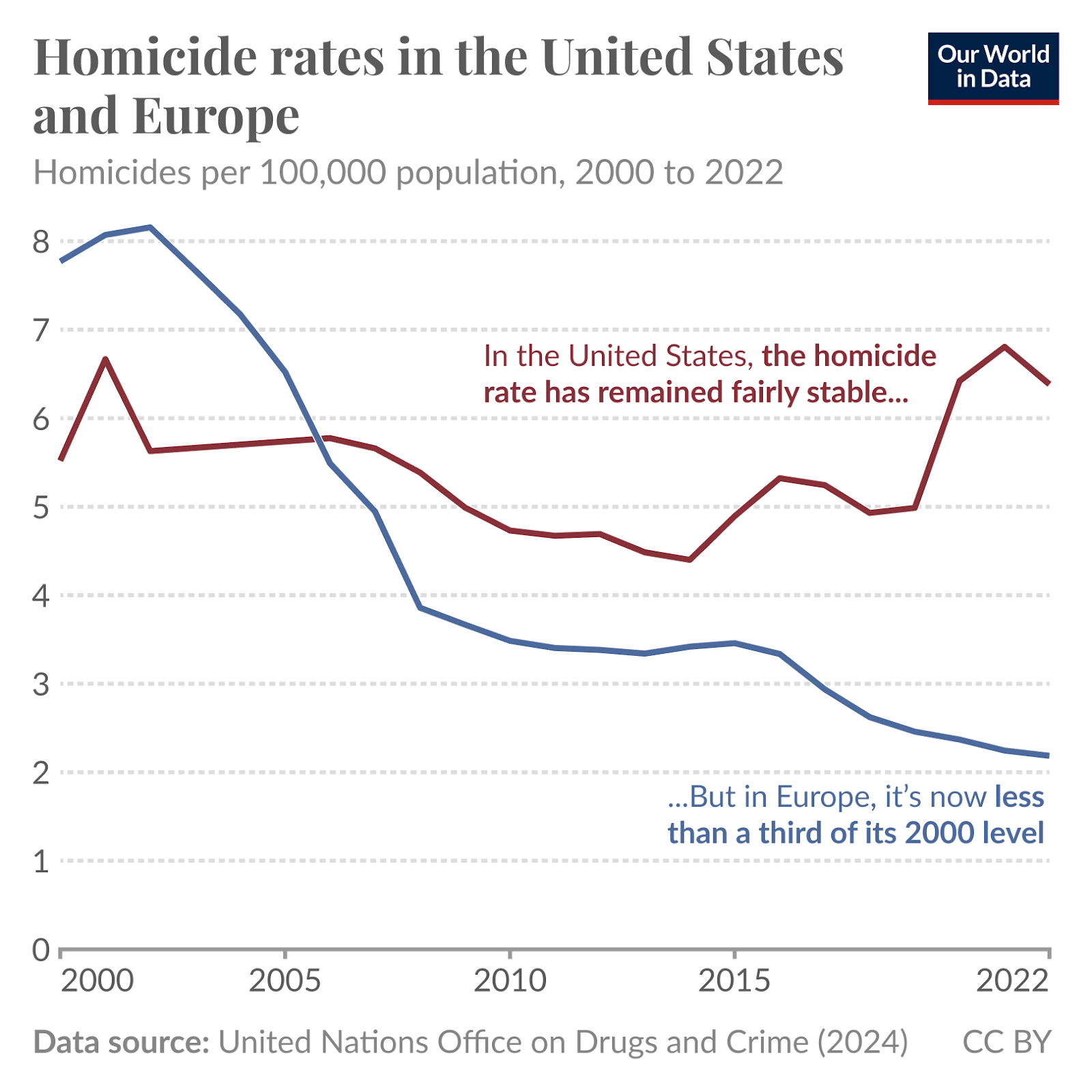 Jeden z wykresów, na który powołał się autor omawianego wpisu, porównujący wskaźnik morderstw dla Europy i USA w latach 2000-2022.