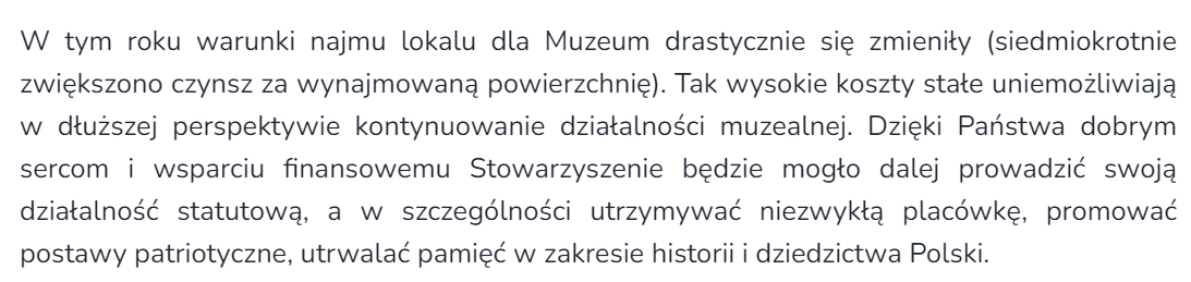 W dalszej części nagrania Czartoryski dodaje: „Twórcy muzeum Tomasz Karasiński i Bogdan Bednarczyk informują, że z 1500 złotych do 15 tysięcy wzrósł czynsz za niewielką [...] nieruchomość, która jest własnością Ministerstwa Aktywów Państwowych. [...] Nie ma żadnej pomocy z m.st. Warszawy”.