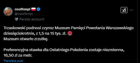 Muzeum nie wynajmowało lokalu od Miasta, lecz od WPH. Tym samym stwierdzenie zawarte w poście użytkownika @coolfonpl, że to prezydent Trzaskowski podniósł czynsz, jest fałszywe.