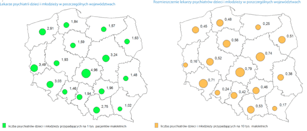 Mimo że na Podlasiu nie ma stacjonarnego oddziału psychiatrii dziecięcej, to liczba lekarzy psychiatrii dzieci i młodzieży przypadających na dziecko nie jest tam najniższa w Polsce. Pod względem stosunku liczby psychiatrów dziecięcych do liczby pacjentów Podlasie plasuje się na 11. miejscu spośród 16 województw.