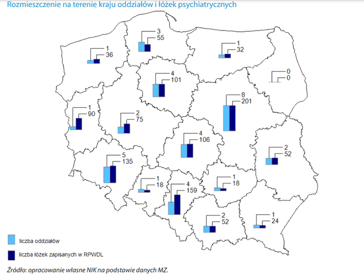 Liczba miejsc na oddziałach psychiatrycznych dla małoletnich bardzo się waha między różnymi województwami. Podczas gdy na Podlasiu nie ma żadnego łóżka, na Mazowszu jest ich 201. Na podstawie raportu NIK-u przedstawiamy jak sytuacja wygląda w całej Polsce.
