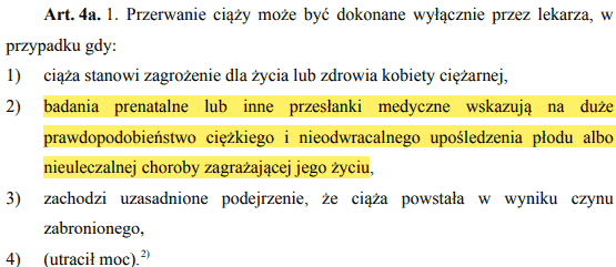 Przerwania ciąży można więc dokonać w trzech przypadkach wymienionych w ustawie. Orzeczenie Trybunału Konstytucyjnego wskazuje, że niezgodny z Konstytucją jest punkt, który zezwala na dokonanie aborcji w sytuacji dużego prawdopodobieństwa ciężkiego i nieodwracalnego upośledzenia płodu lub nieuleczalnej choroby zagrażającej jego życiu.