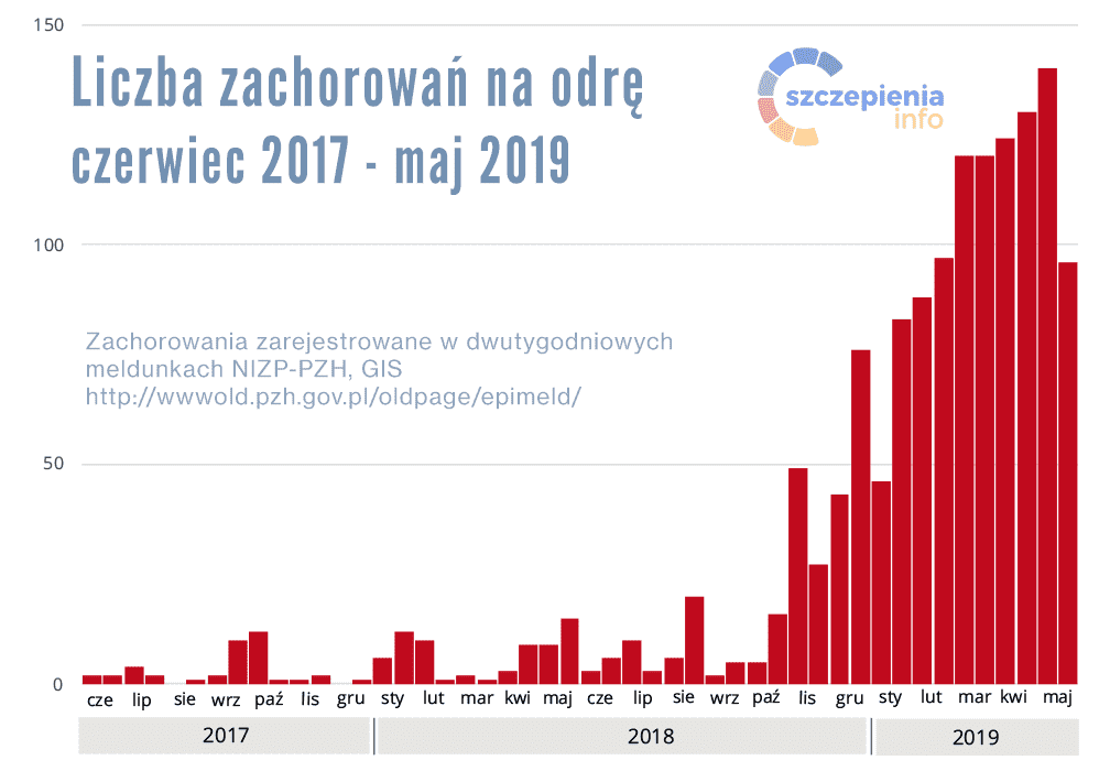 Dzięki szczepieniom zachorowania na odrę występowały w Polsce sporadycznie. Jednak, w konsekwencji spadku odsetka zaszczepionych dzieci, liczba przypadków tej choroby zaczęła rosnąć. W 2019 roku odnotowano aż 1492 przypadki?? czterokrotnie więcej niż w roku poprzedzającym. Bezpośrednim powodem tego jest wysoka zaraźliwość odry - jeden chory zaraża średnio od 12 do 18 osób wrażliwych, czyli tych, które na odrę nie chorowały lub nie zostały zaszczepione. Dla porównania jedna osoba chora na COVID-19 jest w stanie zarazić około 1 osobę wrażliwą (zależy to od stanu epidemicznego i stosowanych obostrzeń).