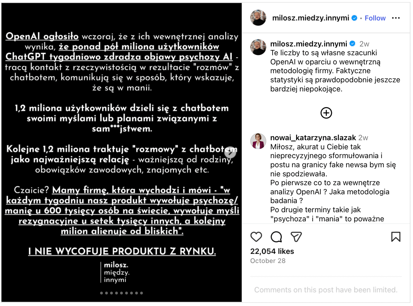 „Open AI ogłosiło [...], że z ich wewnętrznej analizy wynika, że ponad pół miliona użytkowników ChatGPT tygodniowo zdradza objawy psychozy AI - tracą kontakt z rzeczywistością w rezultacie rozmów z chatbotem [...]” – napisał na swoim profilu na Instagramie publicysta i podcaster Miłosz Wiatrowski-Bujacz (@milosz.miedzy.innymi).