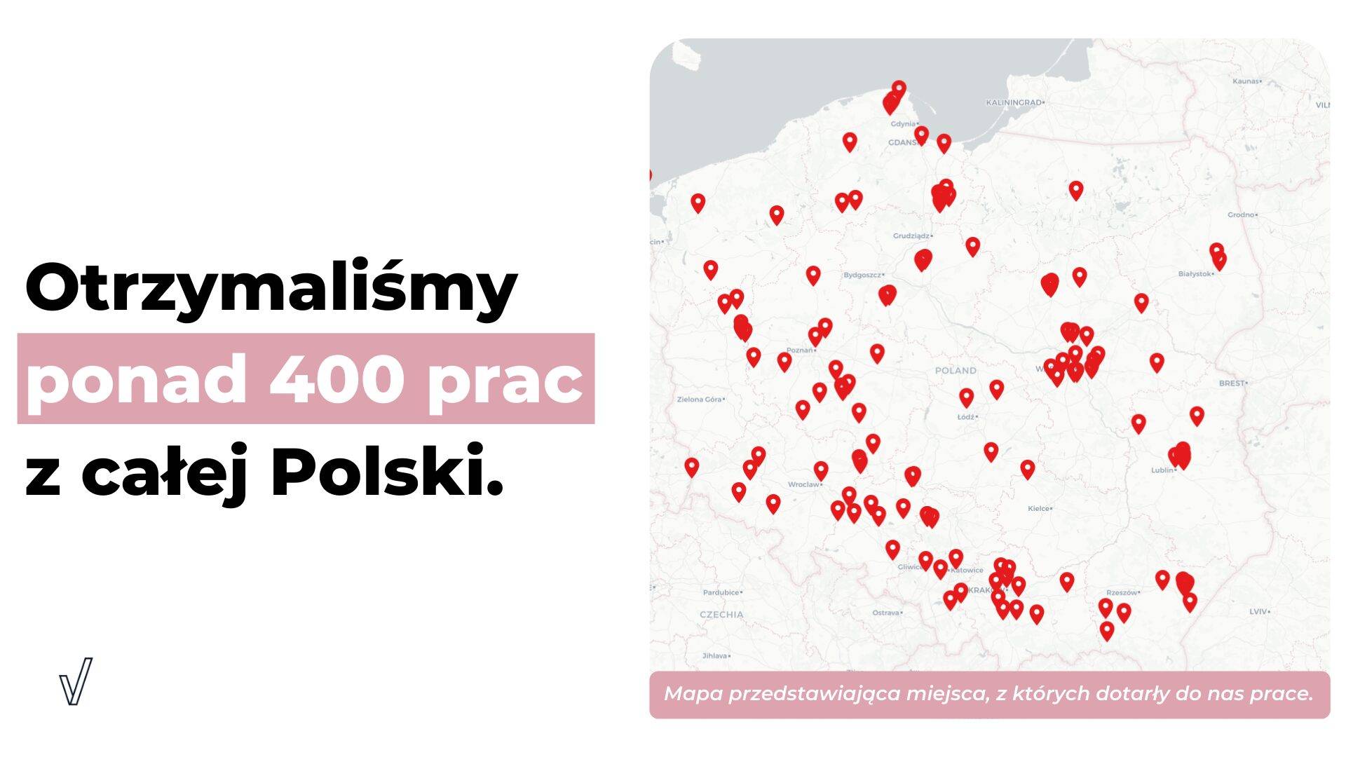Zaskoczeni skalą zainteresowania konkursem, sporządziliśmy mapę, która przedstawia miejsca, z których dotarły do nas prace. Jak widzicie, były to miasta i miejscowości z całej Polski. Jesteśmy pod ogromnym wrażeniem! Szkołą, z której odnotowaliśmy największę liczbę zgłoszeń jest Szkoła Podstawowa nr 6 z Oddziałami Integracyjnymi im. Władysława Gębika w Kwidzynie ? prace powstawały pod opieką pani Elżbiety Zardzewiały. Serdecznie gratulujemy i dziękujemy!