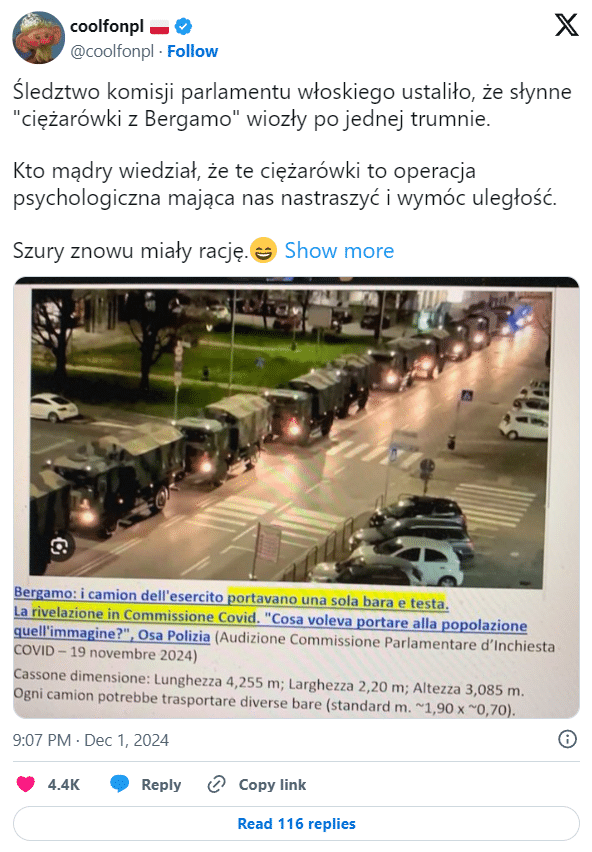 1 grudnia 2024 roku na platformie X (dawniej Twitterze) pojawił się wpis zawierający następującą informację: „[ś]ledztwo komisji parlamentu włoskiego ustaliło, że słynne „ciężarówki z Bergamo” wiozły po jednej trumnie” (pisownia oryginalna). Dalej stwierdzono: „Kto[ś] mądry wiedział, że te ciężarówki to operacja psychologiczna mając nas nastraszyć i wymóc uległość. Szury znowu miały rację”.