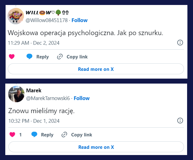 Większość komentujących uznała tę informację za prawdziwą. „Wojskowa operacja psychologiczna. Jak po sznurku” – napisał jeden z użytkowników. „Znowu mieliśmy rację” – dodał inny.
