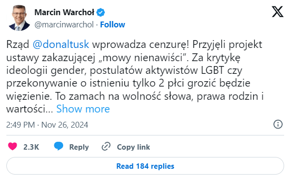 26 listopada 2024 roku na portalu X poseł Prawa i Sprawiedliwości Marcin Warchoł opublikował wpis, w którym stwierdził, że rząd Donalda Tuska „wprowadza cenzurę”. Ma o tym świadczyć przyjęcie przez rząd projektu ustawy rzekomo zakazującej „mowy nienawiści”. Jak pisze Warchoł: „Za krytykę ideologii gender, postulatów aktywistów LGBT czy przekonywanie o istnieniu tylko 2 płci, grozić będzie więzienie. To zamach na wolność słowa, prawa rodzin i wartości chrześcijańskie”.