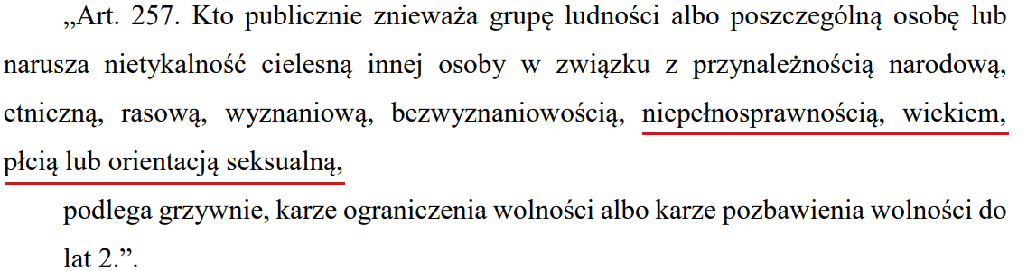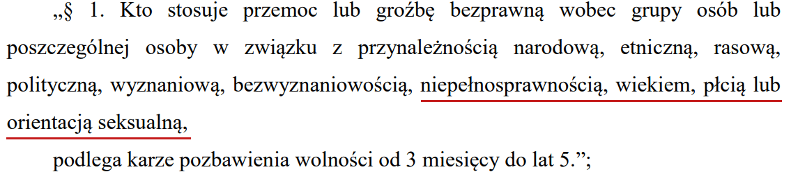 Art. 119 § 1 k.k wprowadza karalność zachowań polegających m.in. przemocy przede wszystkim fizycznej, znęcaniu się, groźbach, pobiciu, popchnięciu, grożeniu pobiciem czy popchnięciem lub wyrządzeniem innej krzywdy, zniszczeniu mienia lub zastosowaniu groźby zniszczenia, które zostały zastosowane wobec osób względu na niepełnosprawność, wiek, płeć lub orientację seksualną. Opisane zachowania nie dotyczą wypowiedzi. Nie można więc uznać, że ograniczają wolność słowa. Dodatkowo, groźby czy przemoc muszą przyjąć formę zindywidualizowanego ataku na określoną grupę bądź osobę. Groźba musi być skierowana do konkretnej jednostki (osoby) ze względu na posiadaną cechę.