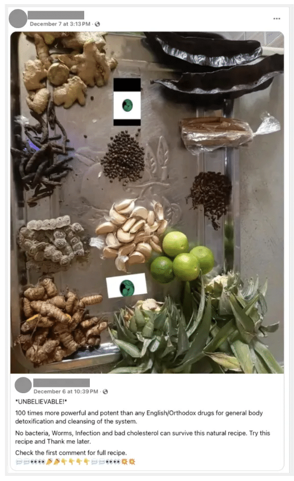 Podczas pandemii COVID-19 w różnych kanałach były rozprzestrzeniane twierdzenia, za pomocą których przekonywano, że spożywanie herbaty, czosnku oraz picie gorącej wody i płukanie gardła wodą z solą może zwalczyć wirusa. Narracje te zyskały popularność częściowo dlatego, że rezonowały z głęboko zakorzenionym zaufaniem do naturalnych środków leczniczych i przedkładaniem ich ponad medycynę zachodnią.