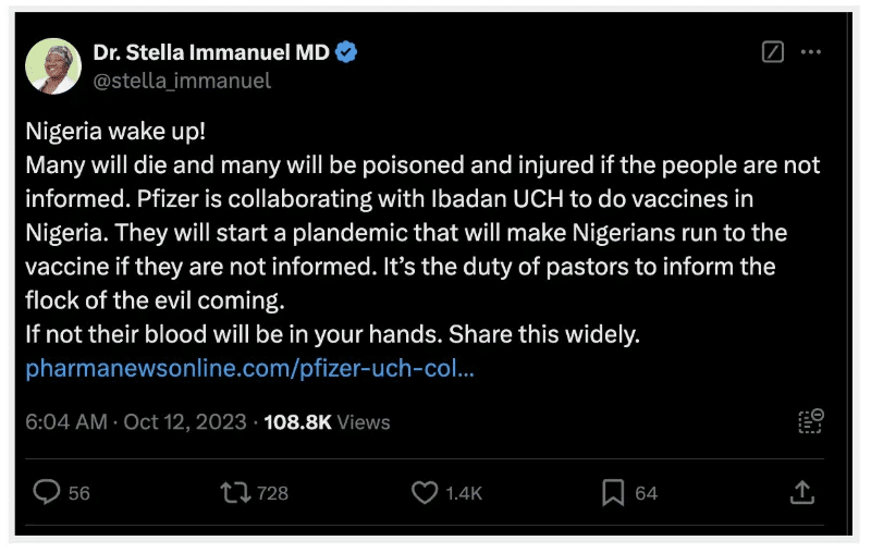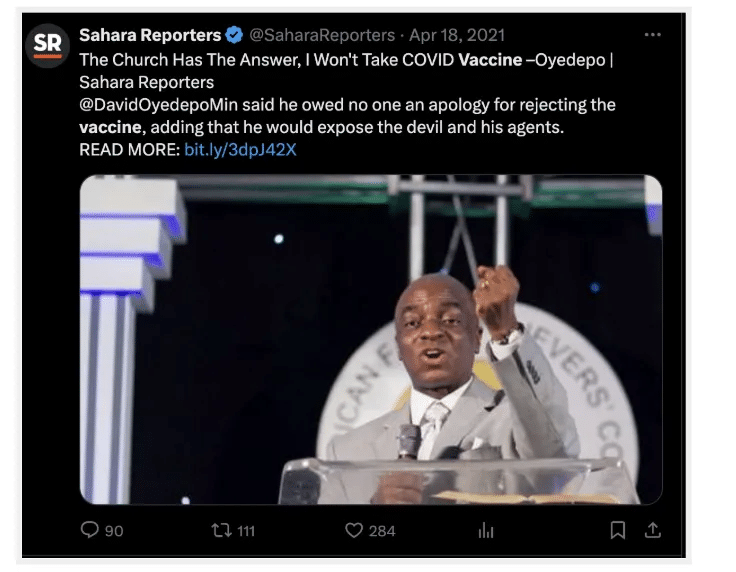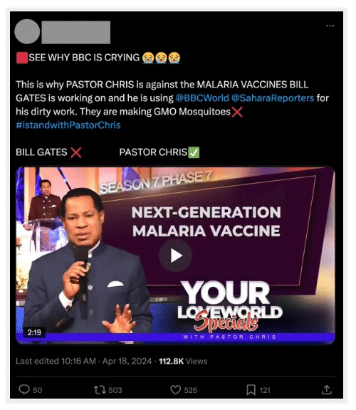 16 kwietnia 2024 roku wyznawca Oyakhilome, popularnego kaznodziei telewizyjnego i lidera kościoła Believers’ LoveWorld, udostępnił post na platformie X. Zawiera on nagranie, na którym duchowny twierdzi, że Afryka nie potrzebuje szczepionki na malarię. Film obejrzano ponad 112 tysięcy razy.