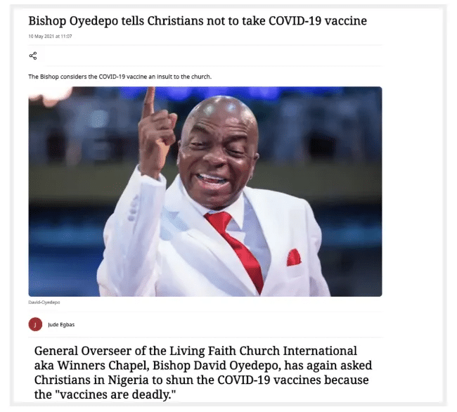 Za przykład może posłużyć msza transmitowana na żywo 9 maja 2021 roku na kanale kościoła Living Faith Church Worldwide w serwisie YouTube (899 tysięcy subskrybentów). W jej trakcie przywódca Kościoła David Oyedepo, zniechęcał członków do przyjmowania szczepionki przeciw COVID-19. Stwierdził, że jest ona „nieprzebadana i śmiercionośna”. Nagranie zyskało około 158 tysięcy wyświetleń.